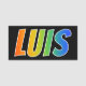 This fun, vibrant, multicolored name tag design features the common first name "LUIS", with the letters of the name having a colourful rainbow spectrum like gradient colouring pattern, on a black coloured background. A nametag like this might be worn by a staff member, a customer service representative, or an employee who is named Luis, to help identify the wearer to others. [~Z0000344]