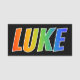 This fun, vibrant, multicolored name tag design features the common first name "LUKE", with the letters of the name having a colourful rainbow spectrum like gradient colouring pattern, on a black coloured background. A nametag like this might be worn by a volunteer, a customer service representative, or an employee whose given name is Luke, to help identify the wearer to others. [~Z0000344]
