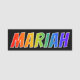 This fun, vibrant, multicolored name tag design features the common first name "MARIAH", with the letters of the name having a colourful rainbow spectrum like gradient colouring pattern, on a black coloured background. A nametag like this might be worn by an employee, a customer service representative, or a volunteer named Mariah, to help identify the wearer to others. [~Z0000344]