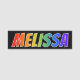 This fun, vibrant, multicolored name tag design features the common first name "MELISSA", with the letters of the name having a colourful rainbow spectrum like gradient colouring pattern, on a black coloured background. A nametag like this might be worn by an employee, a customer service representative, or a staff member whose first name is Melissa, to help identify the wearer to customers or other people. [~Z0000344]