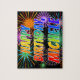 This lively and fun birthday-themed jigsaw puzzle design features the message "HAPPY BIRTHDAY, MICHELE" having a colourful rainbow spectrum inspired gradient pattern, and a vibrant bursting celebratory fireworks inspired background pattern. A vibrant puzzle like this might be a fun way to send birthday wishes to somebody named Michele. [~Z0000465]