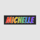 This fun, vibrant, multicolored name tag design features the common first name "MICHELLE", with the letters of the name having a colourful rainbow spectrum like gradient colouring pattern, on a black coloured background. A nametag like this might be worn by a staff member, a volunteer, or a customer service representative whose given name is Michelle, to help identify the wearer to customers or other people. [~Z0000344]