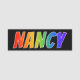This fun, vibrant, multicolored name tag design features the common first name "NANCY", with the letters of the name having a colourful rainbow spectrum like gradient colouring pattern, on a black coloured background. A nametag like this might be worn by a customer service representative, a volunteer, or a staff member named Nancy, to help identify the wearer to others. [~Z0000344]
