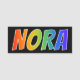 This fun, vibrant, multicolored name tag design features the common first name "NORA", with the letters of the name having a colourful rainbow spectrum like gradient colouring pattern, on a black coloured background. A nametag like this might be worn by a staff member, a customer service representative, or a volunteer whose given name is Nora, to help identify the wearer to customers or other people. [~Z0000344]
