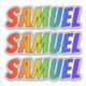 This vibrant, fun, and multicolored sticker design features the common first name or given name "SAMUEL", with the letters of the name featuring a colourful rainbow spectrum inspired gradient colouring pattern. It might be a fun gift to give to somebody whose given name is Samuel. [~Z0000361]