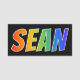 This fun, vibrant, multicolored name tag design features the common first name "SEAN", with the letters of the name having a colourful rainbow spectrum like gradient colouring pattern, on a black coloured background. A nametag like this might be worn by a staff member, an employee, or a customer service representative who is named Sean, to help identify the wearer to customers or other people. [~Z0000344]