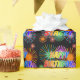 This fun and lively birthday-themed wrapping paper design has the message "HAPPY BIRTHDAY, STACEY" having a colourful rainbow spectrum inspired gradient pattern, and a vibrant bursting celebratory fireworks inspired background pattern. Vibrant wrapping paper like this might be used when wrapping presents being given in celebration of the birthday of somebody named Stacey. [~Z0000456]
