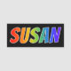 This fun, vibrant, multicolored name tag design features the common first name "SUSAN", with the letters of the name having a colourful rainbow spectrum like gradient colouring pattern, on a black coloured background. A nametag like this might be worn by a staff member, a customer service representative, or a volunteer whose given name is Susan, to help identify the wearer to others. [~Z0000344]