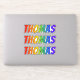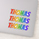 This fun, exciting, and multicolored sticker design features the common first name or given name "THOMAS", with the letters of the name having a colourful rainbow spectrum inspired gradient colouring pattern. It might be a fun present to give to somebody who is named Thomas. [~Z0000361]