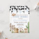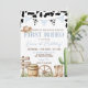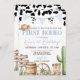 Adorable First Rodeo birthday invitation featuring cow print, cowboy hat, boots, cactus, wagon wheel, wooden signs, and blue gingham bunting. Perfect for a western cowboy-themed 1st birthday party. Personalize with your child’s name, party details, and RSVP information. Ideal for rustic, country, farm, or rodeo-themed celebrations. Printable or digital invitation for easy sharing.