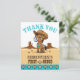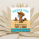 First Rodeo cute cowboy baby horse birthday party thank you card, adorable brown baby horse in a cowboys hat and decorated saddle on Arizona landscape for cowboys western themed birthday party, turquoise and brown colours.