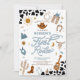 Saddle up for a fun-filled celebration with this rodeo-themed first birthday invitation! Featuring cowboy hats, boots, lassos, steer skulls, cacti, and a bold cow print design, this western-inspired card sets the perfect tone for your little ones big day. With rustic colors of brown, blue, gold, and black, its ideal for a country-style party that guests will remember. Personalize easily with your event details and create a unique keepsake for family and friends.