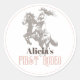 This retro and chic "First Rodeo" girl's first birthday sticker features a cowgirl on a horse. Personalise for your needs. You can find matching products at my store.
