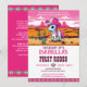 First Rodeo cute cowgirl pink baby horse birthday party template invitation digital instant download, adorable white pink baby horse in a pink cowboys hat and decorated saddle on Arizona landscape for cowboys western themed birthday party, with invitation poem at the back, which can be deleted if not needed