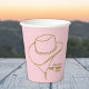 First rodeo with pink minimalist line cowboy hat paper cups for wild west themed first birthday party. Vintage font for party details. Customize with your information. Matching party supplies, invitations and signs are available in the First Rodeo Pink Cowgirl 1st Birthday Baby Girl Collection in The Gathering Designs store.