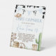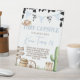 Printable First Rodeo time capsule sign for a cowboy-themed first birthday. Features cow print, blue gingham bunting, cowboy hat, boots, cactus, wooden signs, and rustic western illustrations. Guests can write wishes, predictions, and messages for the birthday boy to open at age 18. Perfect for western rodeo party decor, keepsakes, and memory table displays.