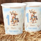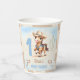 First Rodeo themed 1st Birthday paper cups featuring a cute happy cowboy horse in pastel blue and beige and beige cow skin pattern. Cute design for first or any Birthday of a little boy. Easily personalise all the text including the number of the Birthday. - Kate Eden Art
