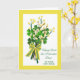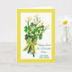 Happy First St. Patrick's Day! In Your New Home, paper greeting card. Send some Irish luck and best wishes for the holiday with this cheery and bright design. Image of a shamrock, pussy willows, and spring branches bouquet. Framed in bright yellow. Art, image, and verse copyright © Shoaff Ballanger Studios, 2021.