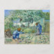 A fine art postcard with the post-impressionist painting by the Dutch artist Vincent van Gogh (1853-1890), First Steps after Millet. A landscape with a mother, father and baby tending to their garden with their baby taking his first steps.