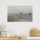 First successful flight of the Wright Flyer, by the Wright brothers. The machine travelled 120 ft (36.6 m) in 12 seconds at 10:35 a.m. at Kitty Hawk, North Carolina. Orville Wright was at the controls of the machine, lying prone on the lower wing with his hips in the cradle which operated the wing-warping mechanism. Wilbur Wright ran alongside to balance the machine, and just released his hold on the forward upright of the right wing in the photo. The starting rail, the wing-rest, a coil box, and other items needed for flight preparation are visible behind the machine.