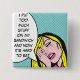 Oh, the humanity! This comic book inspired button design pokes fun at first world problems. It features an emotionally distraught young woman and a speech bubble that reads, "I put too much stuff on my sandwich and now it's hard to eat." The woman and speech bubble are on an aqua and white polka dot background. Let's hope she can find the inner strength to go on! This makes a great backpack accessory.