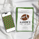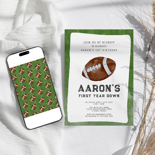 Kick off your little rookie's first birthday in style with this First Year Down 1st Birthday Party Invitation! Celebrate his standout status as the 'Rookie of the Year' with this sporty, football-themed invite. Adorned with vibrant green and brown hues reminiscent of the football field, it sets the stage for a spirited celebration. Join us at kick-off for a sports themed extravaganza that promises fun, touchdowns, and memories aplenty. This tailored invitation captures the essence of an American football game, perfect for your little boy's special day. Get ready to score big and make this first birthday party a winning touchdown moment!