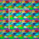 This fabric has a design of a school of fish in green, blue, orange, yellow, red, pink, and blue-green swimming in the ocean.
