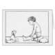 Little boy sitting on the beach staring at a doll with a fish head. Fascinating illustration from the book “Bill the Minder”, written and illustrated by W. Heath Robinson in 1912. This image is from the chapter “The Camp-followers”. “The heads of the fish served the younger children for bricks, or even, after a little trimming, for dolls, with which they amused themselves during the long winter evenings.”