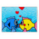 How Sweet! Two little fish in fishy love. Blue and yellow fish on a blue bubble background with floating hearts. Text can be added!