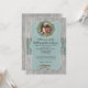 This fisherman sympathy photo design comes with a fishing lure with fishing line swirled around the lure. At the top there is a country wreath made out of pine, cedar and eucalyptus which circles the photo and all sets on top of a light brushed teal with a white border banner. This then sets on top of a barn wood background with a darker brushed teal behind the most important details of the invitation.