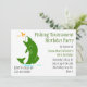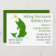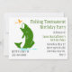 Stylish fishing birthday party invitation done in white, with silhouette graphics of a green coloured big mouth bass jumping, from the water, after a orange bug. Text in green and black is ready to personalise for your special day. Great party idea for the avid fisherman.