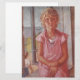 This design features a vintage painting by the Russian artist Kuzma Petrov-Vodkin (1878–1939). It shows a young girl sitting on a windowsill. She is waiting for her father to return home from the sea, where he is working as a fisherman. The window is open and the girl can feel the sea breeze. The coastal landscape can be seen in the distance, with a boat sailing on the water. There is also a young woman or girl walking along the path beside the open window. The original art was painted in 1936.
