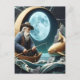 A man in a boat fishes under a large, full moon. His fishing line is attached to a large fish that is jumping out of the water. The scene is rendered in a paper-like style with waves made of folded paper.
