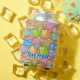 Seamless pattern background of colourful happy, smiling fish cartoons. Custom text on both sides.