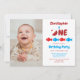 Fishing first birthday gifts with red and blue fish and fisherman's bobber. Photo template via Pixabay licensed under CC0 and must be replaced with your own photo