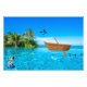 A digital illustration features a vibrant tropical scene with a woman, a boat, and various elements of nature. The woman, who appears to be Caucasian with fair skin and brown hair, is around 25 years old. She is sitting on a blue exercise ball in the water, wearing a grey sports bra and black shorts. The water is a clear, bright turquoise, resembling a swimming pool that extends to the horizon, blending seamlessly with the ocean. Palm trees and lush greenery are visible in the background, with a colourful parrot perched on one of the trees. A blue butterfly flutters in the sky. A wooden rowboat with oars is positioned in the water, seemingly floating. Behind the boat, three whale tails emerge from the water, adding a whimsical touch to the scene. The sky is a clear blue with a few scattered clouds. The overall style is cartoonish and vibrant, with a focus on bright colours and clear lines. The composition is balanced, with the various elements arranged to create a sense of depth and harmony. The lighting is bright and even, enhancing the cheerful and idyllic atmosphere of the scene.