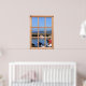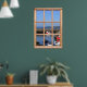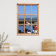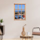 This view of bright fishing boats from a wood window frame is the companion of the other Boats in the Harbour window poster. It shows a scene at a pretty fishing harbour where the painted boats await their next sailing. Buy the posters as a pair and display this one to the left (as you look at the wall) of the other one to create the appearance of a real view out of 2 windows on your wall!