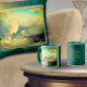 The painting is encased in a clear ivory frame, set against a deep green background, evoking a moody atmosphere that adds depth to the image.