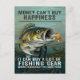 This image depicts a largemouth bass with its mouth open, appearing to be about to bite a lure. It is a humourous illustration of the statement, Money cant buy happiness, but it can buy a lot of fishing gear. The image is a popular motivational poster for fishing enthusiasts.