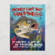 A cartoon bass with a wide-open mouth is about to bite a fishing lure, surrounded by colourful underwater scenery. The text reads, Money cant buy happiness. It can buy a lot of fishing gear, which is basically the same thing.
