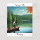 Keep in touch with this postcard showing a man fishing in a canoe on a lake surrounded by pine trees and mountains with beautiful reflections in the water.