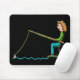 Fishing design shows a patient angler sitting by the water watching float attached to end of rod and line.