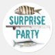 Fishing theme surprise party stickers, or envelope seals, to use with our fishing themed adult party invitations. (Or change the text to "You're Invited", or "Birthday Party"). Teal blue printed text is centred with saltwater fish images and a rod and reel. Use to celebrate any type of occasion for the man who lives to fish. Round and square stickers will work best. They will print as you see them so choose a correct shape.