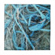 A colourful design of fishing net and bright blue rope from a boat and stored on the harbour jetty.