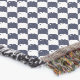 Throw blanket with a unique houndstooth like pattern of little fish in navy blue and white.
