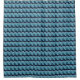 Aquatic shower curtain with a blue pattern of intertwining waves and fish.