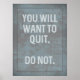 The key to reaching goals that you set for yourself is to persist. There will be days that you do not want to practice, days that you do not want to work out...days that you will want to quit. Do not! Motivate yourself or others with this steely grey grunge-look poster featuring the quote "You will want to quit. Do not." in a paler grey text.