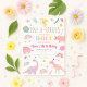 This adorable birthday invitation features hand drawn dinosaurs, rainbows and leaves in pastel colours.