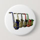 A button with five colourful saxophones together symbolising the love of the instrument and the soft smooth music of the sax in blues and jazz and accompaniment to other genres solo or in groups. Five saxophones in blue, gold, black, red and green with gold keys arranged in a line.