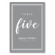 This design was created for smaller intimate wedding celebrations. Simple, minimalist and elegant Wedding Table Number FIVE design features a contemporary design with a double frame border in crisp white on a sophisticated grey background. The chic design provides timeless yet modern sophistication. Personalise wedding table design with your wedding details in crisp white lettering and script. The back of the card is a duplicate of the front. Order one for every table with the individual table numbers.